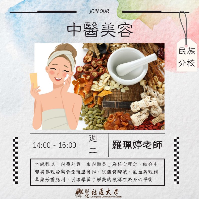 | 第七週 | 7 | 基礎美容乳液DIY實作 | 基礎乳液的組成與中藥植物萃取應用,說明油水比例與乳化原理,講師示範並帶領學員實作保濕乳液,體驗天然護膚與中醫草本養顏的結合。 |