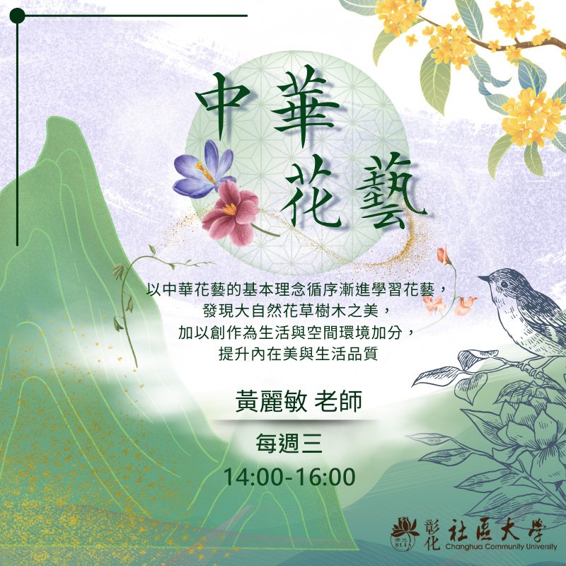 中華花藝不僅是一門技藝,更是一種融入生活的美學修養。透過學習花型設計、花材運用與枝葉搭配,本課程帶領學員循序漸進地掌握花藝技巧,使每一次創作都能展現自然意境與文化深度。在花草間調和色彩、造型與層次,不僅能提升環境美感,更能啟發個人審美素養,讓花藝成為日常的心靈寄託。