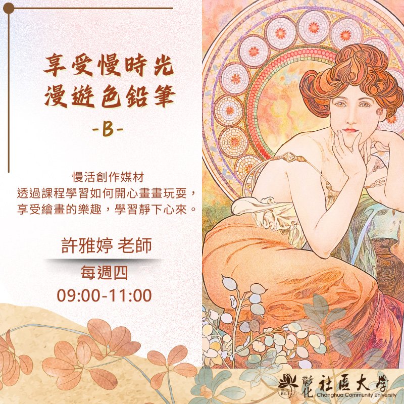 | 第五週 | 5 | 色鉛筆的花園散步:畫出田尾的芬芳。質感與細節表現 | 花卉、葉片與植栽造景 教學如何呈現植物的層次感與細節,例如花瓣的透光感、葉片紋理與陰影處理。透過局部練習培養耐心與專注力,並引導學員體驗「慢畫」的療癒過程,將情緒融入筆觸之中。 |